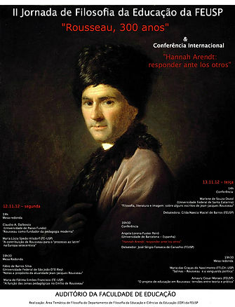 O segundo ciclo de palestras, sob o título, “II Jornada de Filosofia da Educação – Rousseau, 300 anos”, ocorreu nos dias 12 e 13 de novembro de 2013. Desta vez, a área de “Filosofia e Educação” não podia deixar de fazer outra homenagem, tendo em vista os 300 anos que nos separavam do nascimento de um grande pensador do além mar: o filósofo e educador suíço Jean-Jacques Rousseau, cuja influência se estende até nós através de outros eminentes educadores, como John Dewey, Maria Montessori, Georg Kerschensteiner, dentre outros, considerados representantes do movimento que ficou conhecido como a escola nova, concepção de educação com diversos matizes e bastante presente nos documentos oficiais e nas salas de aula das escolas brasileiras. A nova comissão organizadora, constituída pelos professores da casa Gilda Naécia Maciel de Barros, Maria de Fátima Simões Francisco e Marcos Sidnei Pagotto-Euzebio, pôde contar com a presença de colegas especialistas no filósofo genebrino que trouxeram diferentes olhares tanto para a sua obra como também para a revolução educacional deflagrada por suas idéias. Em particular por sua proposta de uma educação negativa atrelada a uma nova concepção de homem, o que levanta questões que envolvem diferentes domínios do saber, como a literatura, a ética, a política e as relações entre teoria e prática , tão argutamente escrutinadas nos textos apresentados pelos convidados externos, os professores Marlene de Souza Dozol (UFSC) e Claudio A. Dalbosco (Univ. de Passo Fundo); e os colegas da FEUSP, Maria de Fátima Simões Francisco e Amaury Cesar Moraes.